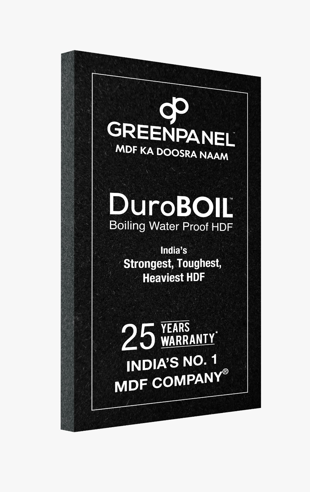 দীর্ঘস্থায়ী পারফরম্যান্সের জন্য তৈরি, DuroBOIL™️ হলো ভারতের সবচেয়ে শক্তিশালী, মজবুত এবং ভারী HDF, যা স্থপতি, ইন্টেরিয়র ডিজাইনার এবং আসবাবপত্র নির্মাতাদের জন্য এটিকে একটি নির্ভরযোগ্য পছন্দ করে তুলেছে। এর কঠিন, নিশ্ছিদ্র কাঠামো চমৎকার স্থায়িত্ব এবং শক্তি নিশ্চিত করে, এমনকি প্রতিকূল পরিবেশেও যেখানে প্রচলিত বোর্ডগুলো প্রায়শই ব্যর্থ হয়।